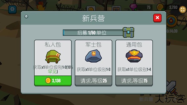 4、玩家可以点击右下角的“新兵营”即可使用金币去购买军队礼包,礼包可以开出士兵。