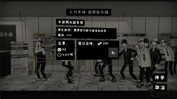 3、玩家需要前往游戏中的人力市场,承接不同的“打工”小游戏。不同的“打工”小游戏所需要的耗时、难度、给予的报酬都有所不同,所以玩家还是要仔细挑选一下。