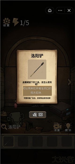 1、玩家需根据游戏指引使用洛阳铲打开古墓的洞口,测试墓中里有氧气再进去。