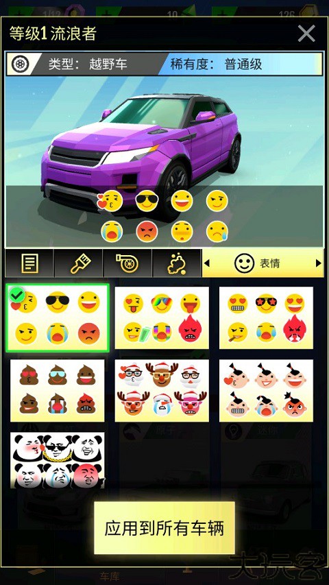 车辆可更换皮肤、尾焰、表情等个性配件。