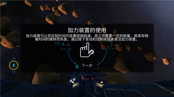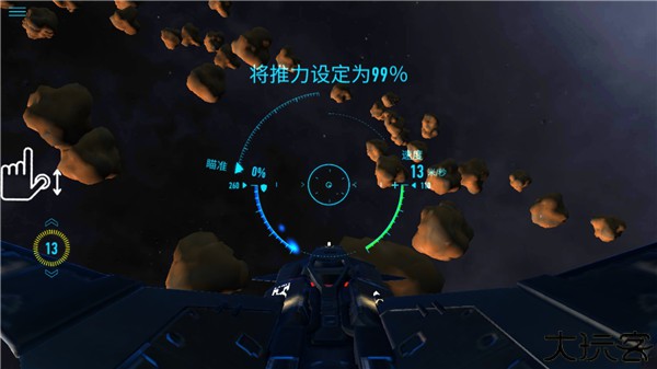 4、玩家在屏幕的左侧往上推将推力提升使飞船向前发动。