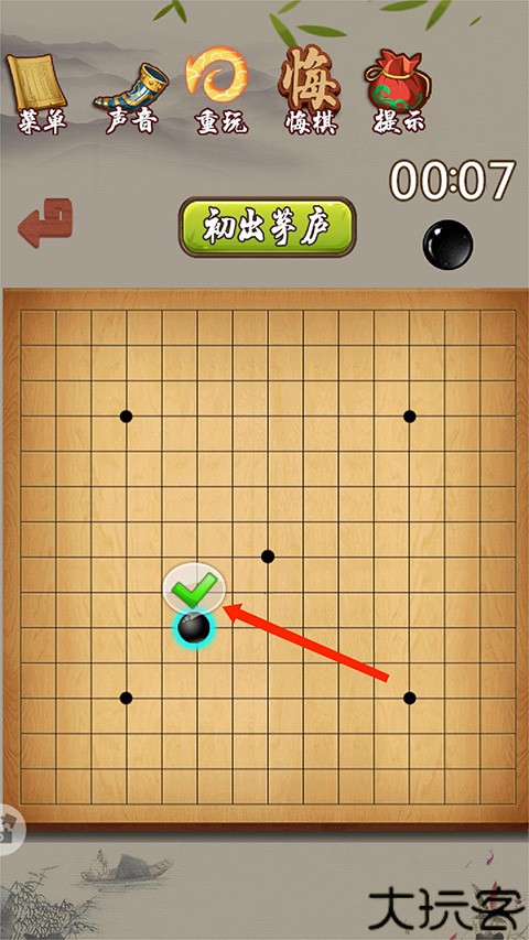 黑棋先行,点击落点后确认图标出现即可完成落子。