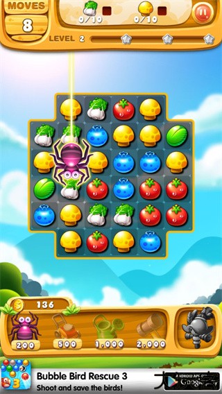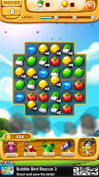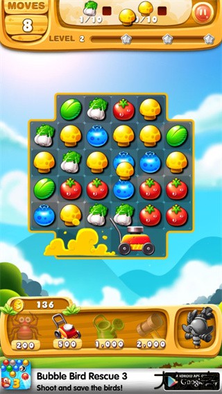 狂热的花园安卓版(gardenmania)是以农作物为主题的三消休闲游戏,整体画风温馨可爱,带有浓浓的田园气息,玩起来非常轻松治愈。在游戏中,玩家可以透过消除各种可爱的蔬菜和水果来收集资源,打造属于自己的农场乐园。同时,狂热的花园安卓版的关卡设计丰富,每关都有不同的目标,玩家需要动动脑筋来完成消除任务。而且,还有很多实用的道具,比如交换、清除等,能帮玩家更快通过难关。