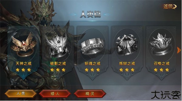 分为人类、矮人和精灵三种魔戒,分别解锁独特技能和地图,提升战力与游戏成就感。