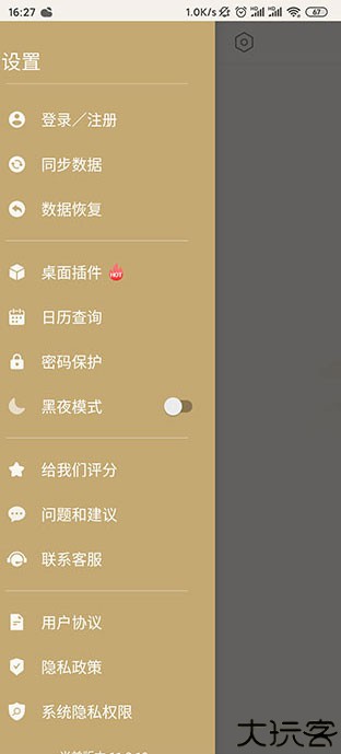2、点击左上角的符号能够打来设置功能,其中有着登入注册、同步数据、卓面插件、日历查询、密码保护、黑夜模式等工具。