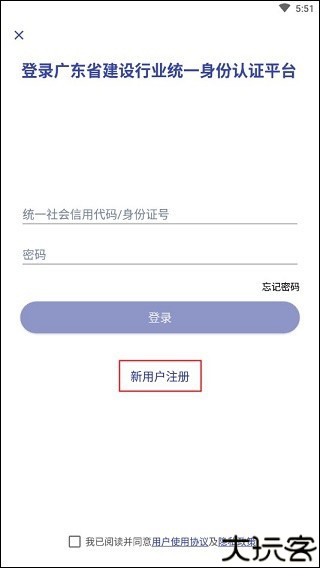 1、请打开“粤建通”App,点击主页页面的【新用户注册】,根据实际情况进行注册。