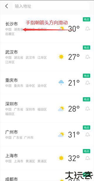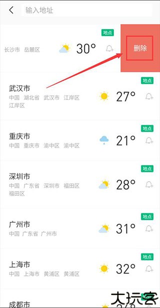 滑动后右侧出现删除选项,轻触即可完成该城市的清除。