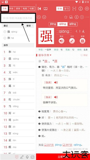 2、进入主界面后,左上角的输入框,可以搜索生字词。