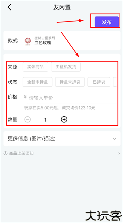 4、输入物品详情、成色、定价及数量,确认无误后点击发布上架。