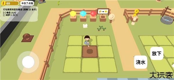 3、操控角色移动至耕地处点击水桶,进行浇灌操作助力成长。