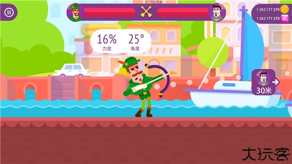 1、首先进入弓箭手们游戏,通过滑动屏幕来控制力度、角度和角色的攻击方向。