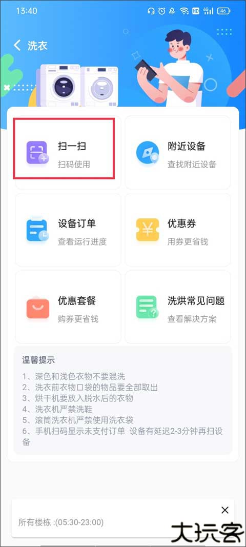1、一键扫码就能使用设备,洗衣服、吹头轻松简单。