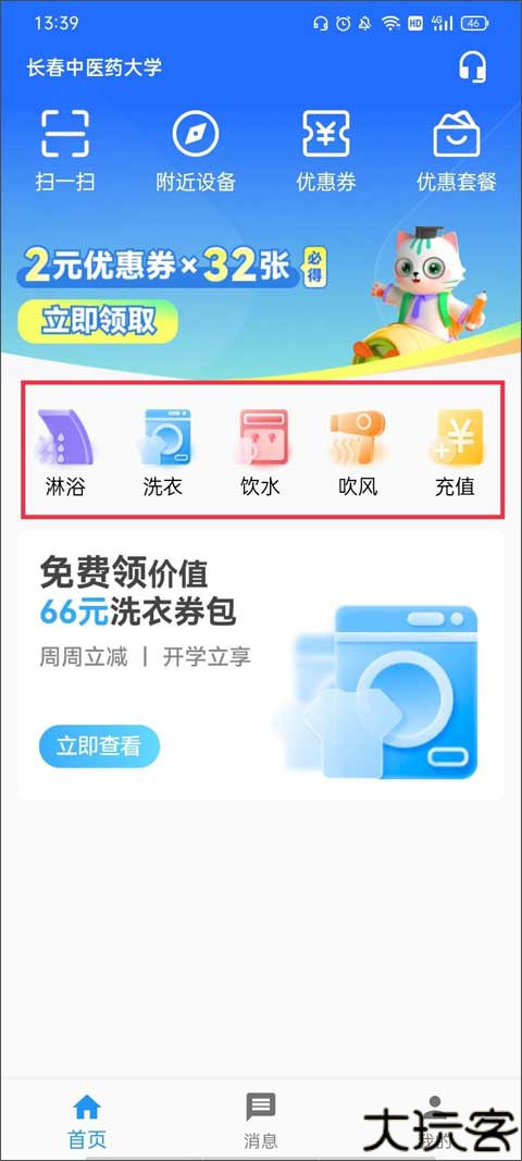 2、确定好学校之后,接下来就是选择屏幕上方的功能选项,如果用户想要选择淋浴、洗衣或者饮水就可以选其中一项。