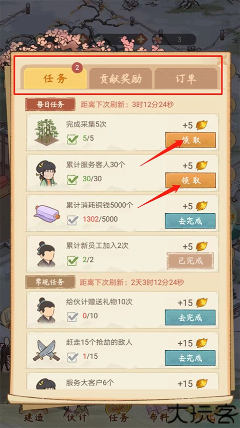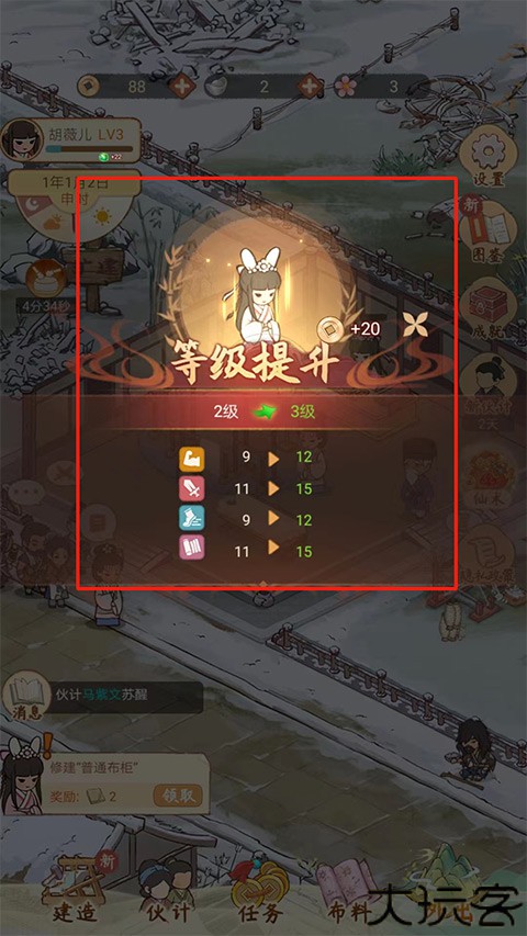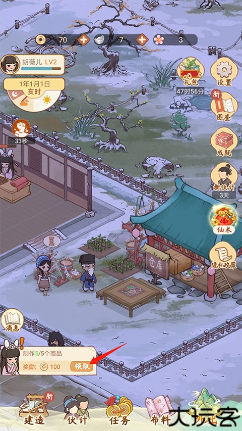 主界面设有建造、伙计、任务、布料及外出多项功能。