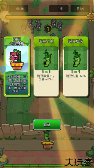 2、等收集足够的阳光,上面的能量条就会满了,随后系统会让玩家选择一个技能加强,玩家也可以再选一个植物战斗。