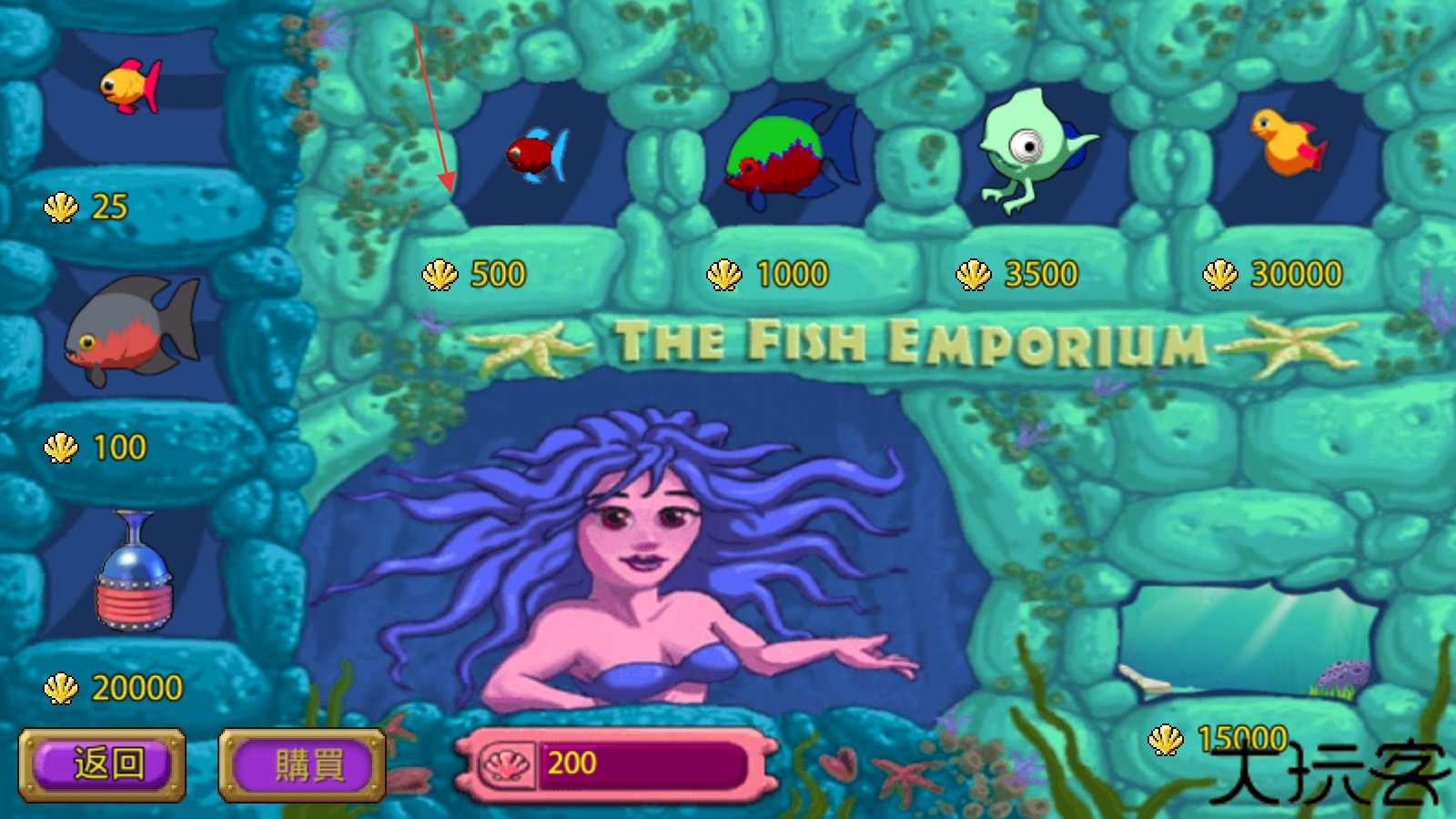 3、在商店界面,查看所指的鱼类或道具及其对应的贝壳价格,点击【購買】按钮购买相应物品。