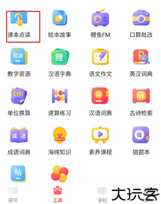 打开应用后点选“工具”栏目,再点击课本点读选项。
