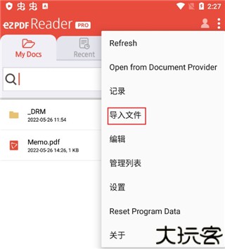 3、选择“导入文件”以添加本地PDF文档进入阅读列表。