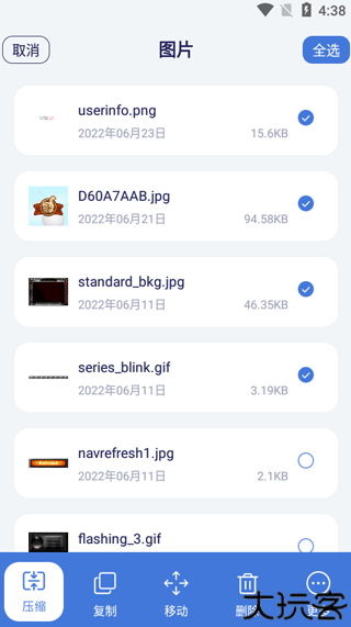 3、在文件压缩这里,用户能对图片、音视频等各种文件进行压缩,通过勾选图片,之后就能对图片进行压缩、复制、移动、删除等操作。