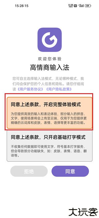 1、打开高情商输入法键盘软件,先勾选开启完整体验模式。