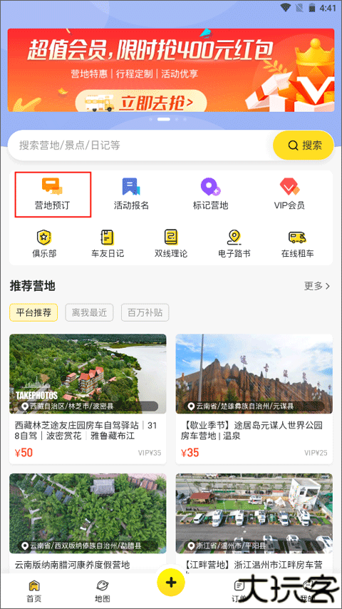 1、进入首页选择“营地预定”,快速进入预订流程。