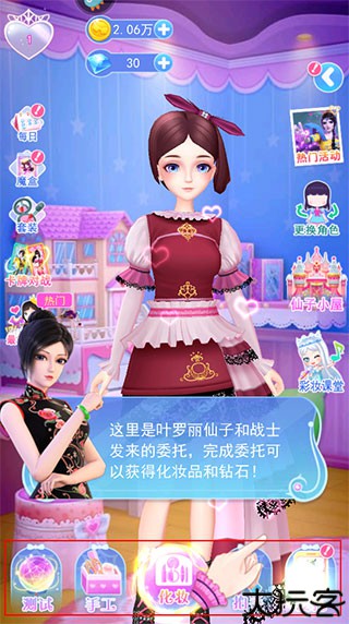 2、游戏界面,有化妆、委托、仙子小屋、彩妆课堂、每日签到、开魔盒等游戏功能。