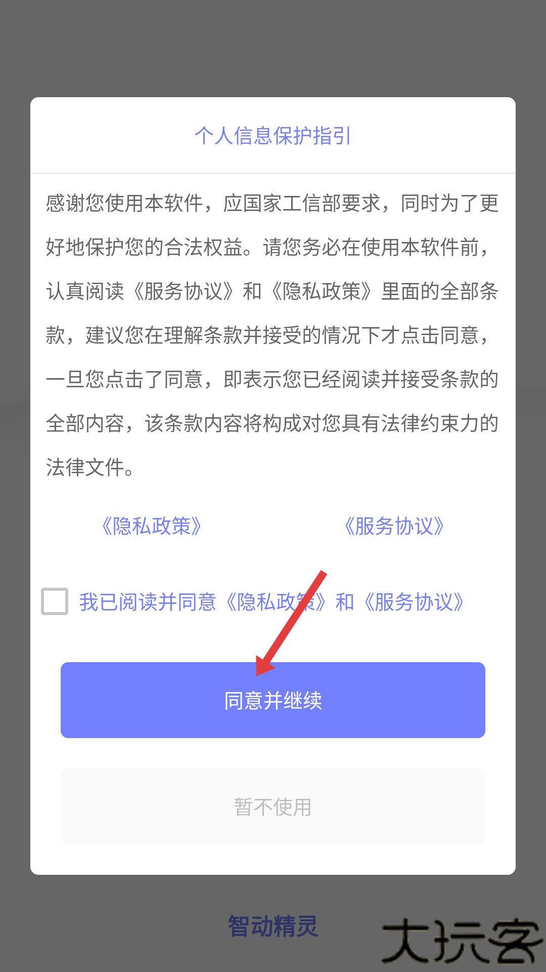 1、打开进入智动精灵软件里,需在用户协议和隐私政策界面点击同意。