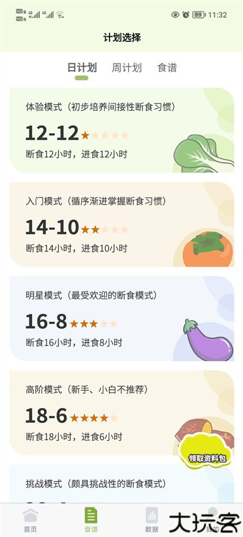 2、会收录当下热门的断食模式,包括16:8间歇性断食和5+2轻断食方案等等。