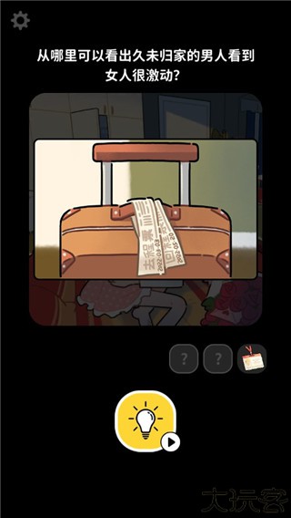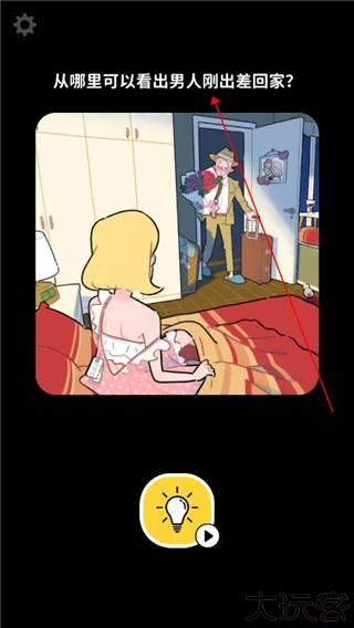 2、比如,题目问怎么知道男人刚回来,从行李箱就可以看出,点击行李箱。