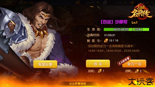 1、角色等级达46级后,解锁南蛮入侵限时挑战玩法。