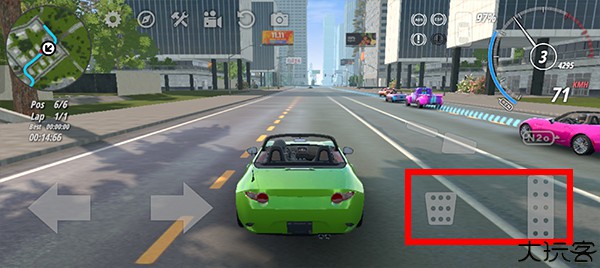 2、右下角的三个按键则分别是用来控制车辆的手刹、刹车、前进的按钮。