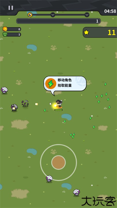 2、屏幕下方滑动摇杆以控制角色的移动,靠近即可拾取能量。