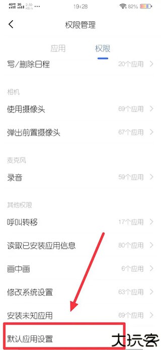 3、向下滑动页面,点击默认应用管理进入默认程序配置界面。