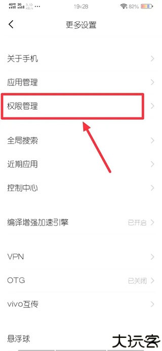 2、在设置中进入权限区域,找到权限管理模块进行下一步操作。