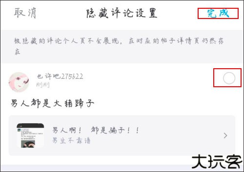 4、然后选择你想要隐藏的评论,勾选它,并点击上方的完成即可。