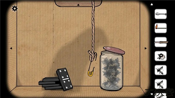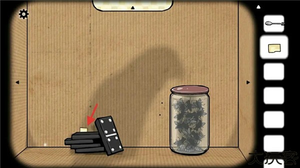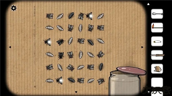 7、用刀撬开盖子,根据纸条上的提示:「每行每列不能有三个苍蝇或者卵连着」,按照提示改变苍蝇和卵获得三个「发光的苍蝇」。