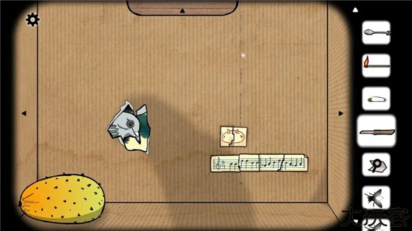 8、用刀划开纸壁上的裂缝出现一只鸽子头,点击鸽子五次会出现一段音符。