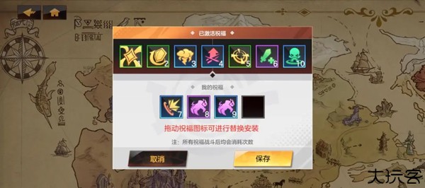 7、冒险者最多可以同时激活7项祝福,此外还可额外保存4个祝福,玩家在开始战斗前可以任意替换祝福以使用。而祝福有消耗次数限制,所有已激活的祝福都在战斗后均会消耗次数。