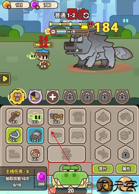 角色上方自动作战,点击小鳄鱼可收集装备资源,战力逐步提升。