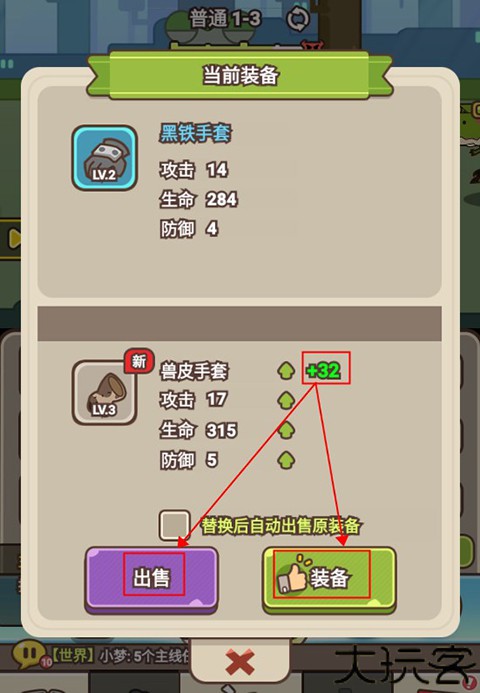 同类装备可比战力选用或售出,优化背包收益,轻松升级角色。