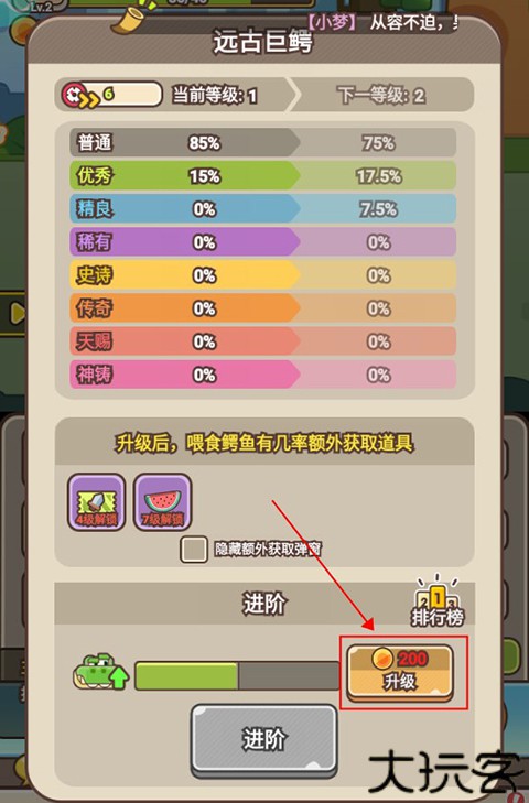 出售装备得金币,可强化鳄鱼等级,提升高品质装备掉落几率。