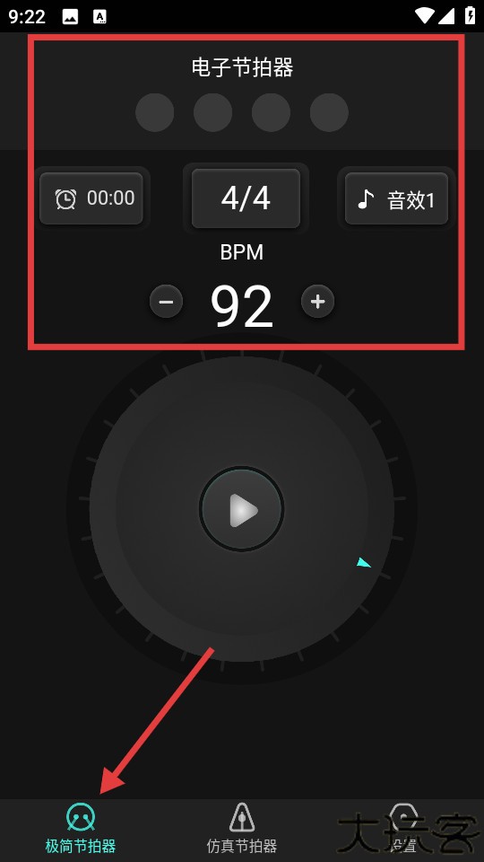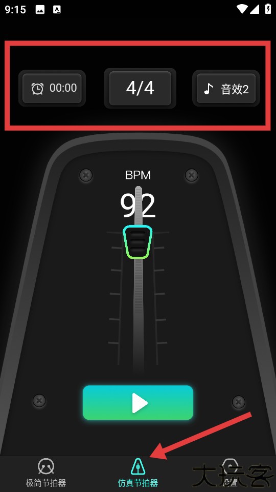 切换至仿真界面后,点击底部渐变播放图标即可开启模拟节拍。适合用于创作、演奏校准或现场练习,节奏参数可自由设定。