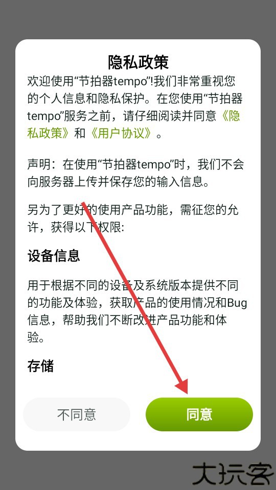 第一次启动应用时,会显示服务协议与隐私政策内容,需点击“接受”以进入主页面,保障使用安全合规。