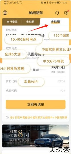3、点击全球租车页面,展示服务网点等优势,能输入取车地点,有24小时救援等服务,可立即选车。
