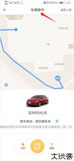 1、点击车辆操作页,显示地图、车辆信息,有闪灯、开锁取车和导航功能,可上报故障。