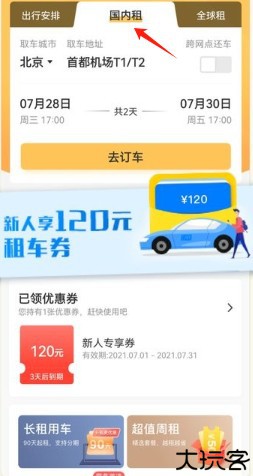2、国内租车预订页,可选择取车城市、地址、时间,有新人租车券及长租等用车优惠活动。
