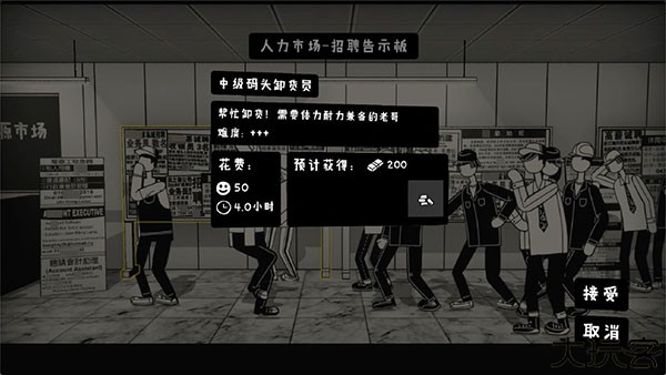 2、玩家需要前往游戏中的人力市场,承接不同的打工小游戏。不同的打工小游戏所需要的耗时、难度、给予的报酬都不同,所以玩家还是要仔细挑选一下。如果去晚了,人力市场就没有好的日结工作啦。