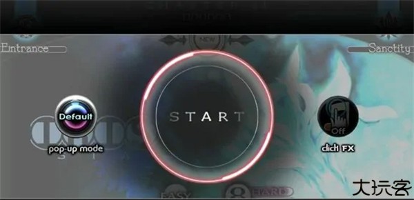 当玩家在曲目界面单击后,会进入游戏准备界面。点击中间的START键(蓝色圈,若为隐藏曲目会显示红色圈)即开始游戏。开始键左右分别为pop-up mode设定按钮与click fx设定按钮。