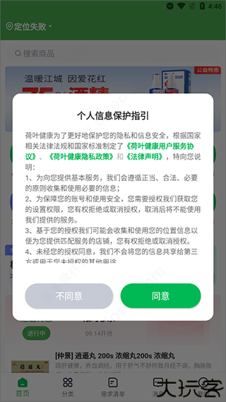 1、打开荷叶健康手机版进入后,阅读完了在点击同意。