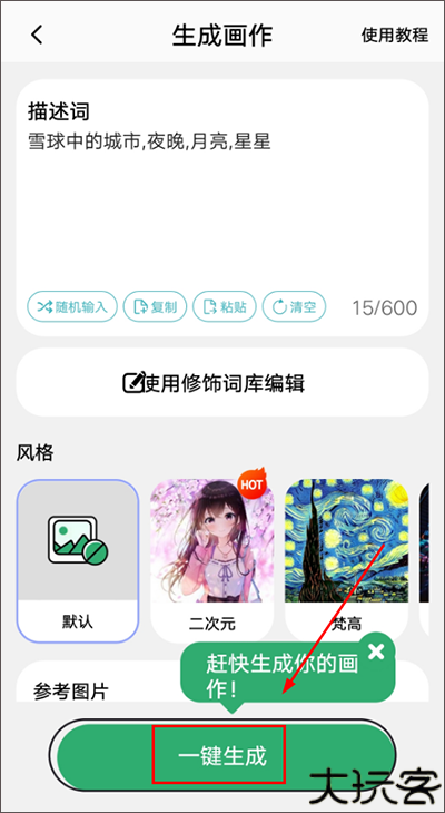 系统根据描述生成个性画作,风格包含写实与幻想等。